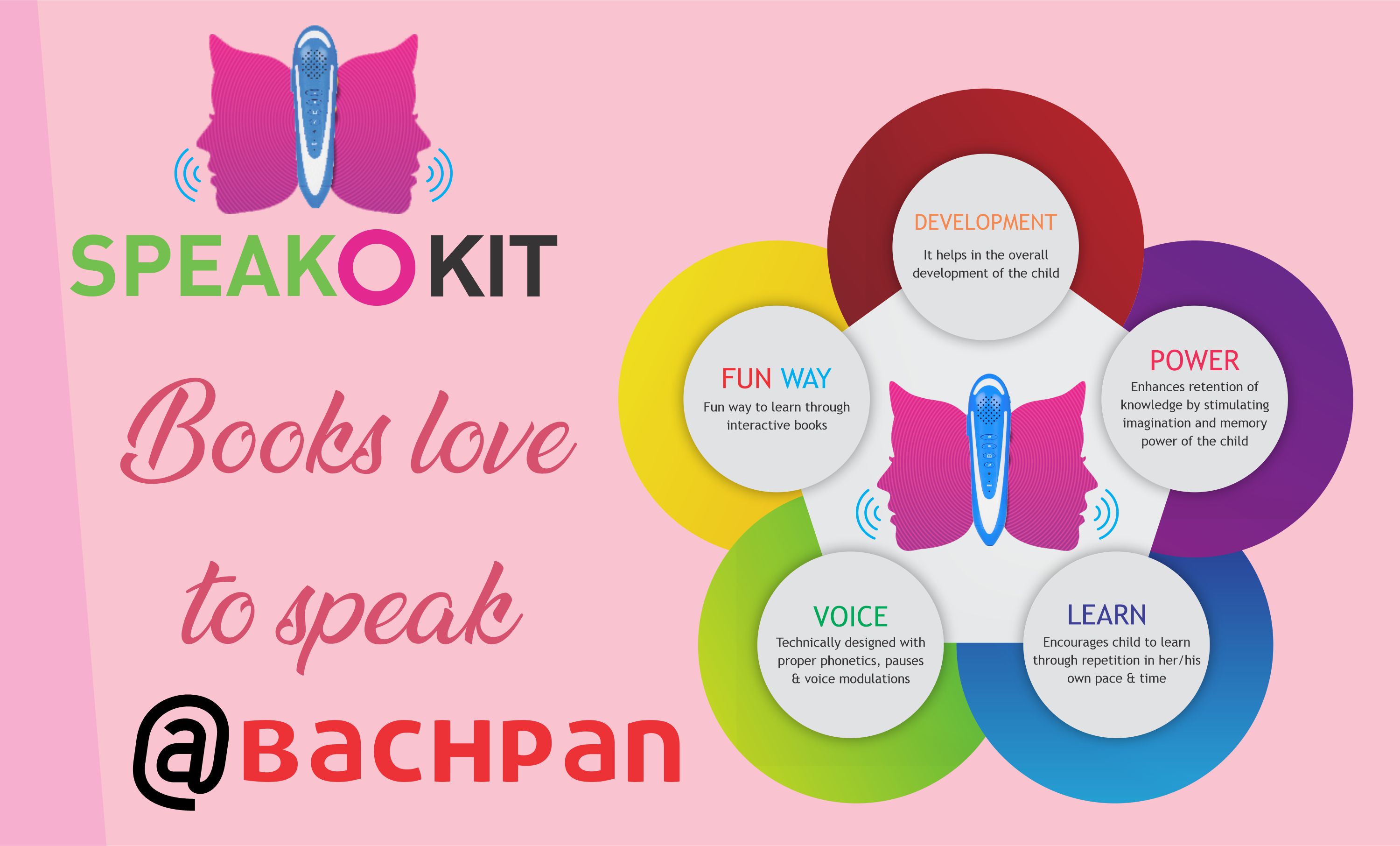 Established in the year 2004, Bachpan began its phenomenal journey. During all the times of development of a child-centric and quality Montessori education, Bachpan learnt an art of innovation. Innovation of teaching processes, techniques and tools what it aimed at. The entire curriculum development team was deployed to think of including a powerful learning content to foster long-term and fun-filled learning to toddlers. We never aimed at stopping at the kind of teaching that happens just with a black-board and some Montessori toys. We looked for something which can stand out exemplarily in the field of preschool education. In a meeting one day, a team member murmured, “Oh! I wish if books could speak!” There we were! We asked her to repeat what she just said. Hesitantly, she said, “I wish if books could speak!” Why not? Was that easy? Not at all! The real struggle had begun by then. We knew it would require a lot of effort and thought process to create something that would enable books to speak. The brainstorming began. There were ample of researches that were studied in detail and even done at our own end. It was then decided that a Bachpan will be proud to create its own kit which would contain a pen and a book which shall speak. This kit was called ‘Speak-o-Kit’. Prismart, the technical arm at Bachpan was at the developing end of the kit. They wished to programme a pen in such a manner which shall speak up the word on which it is pointed at in a book. To a sweet surprise, we finally developed a functional speak-o-pen which the nation today commonly calls as a set of talking books and talking pens. What an elixir formula proving to be a breakthrough in the teaching-learning process. At the point of reaching a number of 1000 school nationwide in 2014, Bachpan finally gave the world of primary school education, a gift called ‘Speak-o-kit’. It was indeed an important event and a matter of celebration. We celebrated to a matter of fact that being the first school to introduce a phenomenal tech-tool will now serve kids and make the learning experiential. At this, we also realized that nothing is impossible. If we plan and implement techniques systematically, it is possible to develop innovative learning tools that the world could never imagine. We still remember the first demonstration of the Speak-o-pen in the schools. The parents, teachers and the little children were awestruck. They were ready to purchase it at any price we decide. But, we planned to keep it under a price range which is affordable to every parent and no child is devoid of a tool which they can have an easy access to. Every new thing requires a considerable amount of basic training given to the users. A child needs to be taught how to use the speak-o-kit in the best way possible. The training session for the teachers and parents was the next in the bag. We trained our teachers to the core so that they are able to communicate the benefits and usage to the parents. The Speak-o-kit is available exclusively to the BACHPANites at the online shopping portal ‘www.parentskey.com’ powered by Bachpan Play School. There is no more fun to a kid than pointing a pen towards the picture of a fruit in a book and the pen telling him that ‘It’s an Orange’. Not just this, the technical team keeps working in order to update the programme installed in the Speak-o-kit’.