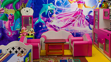 Dining Room is a place to learn the table manners and usage of dining accessories like cutlery, napkins, glasses, etc. This room has chairs and dining table for kids to eat together and share the delicious food.